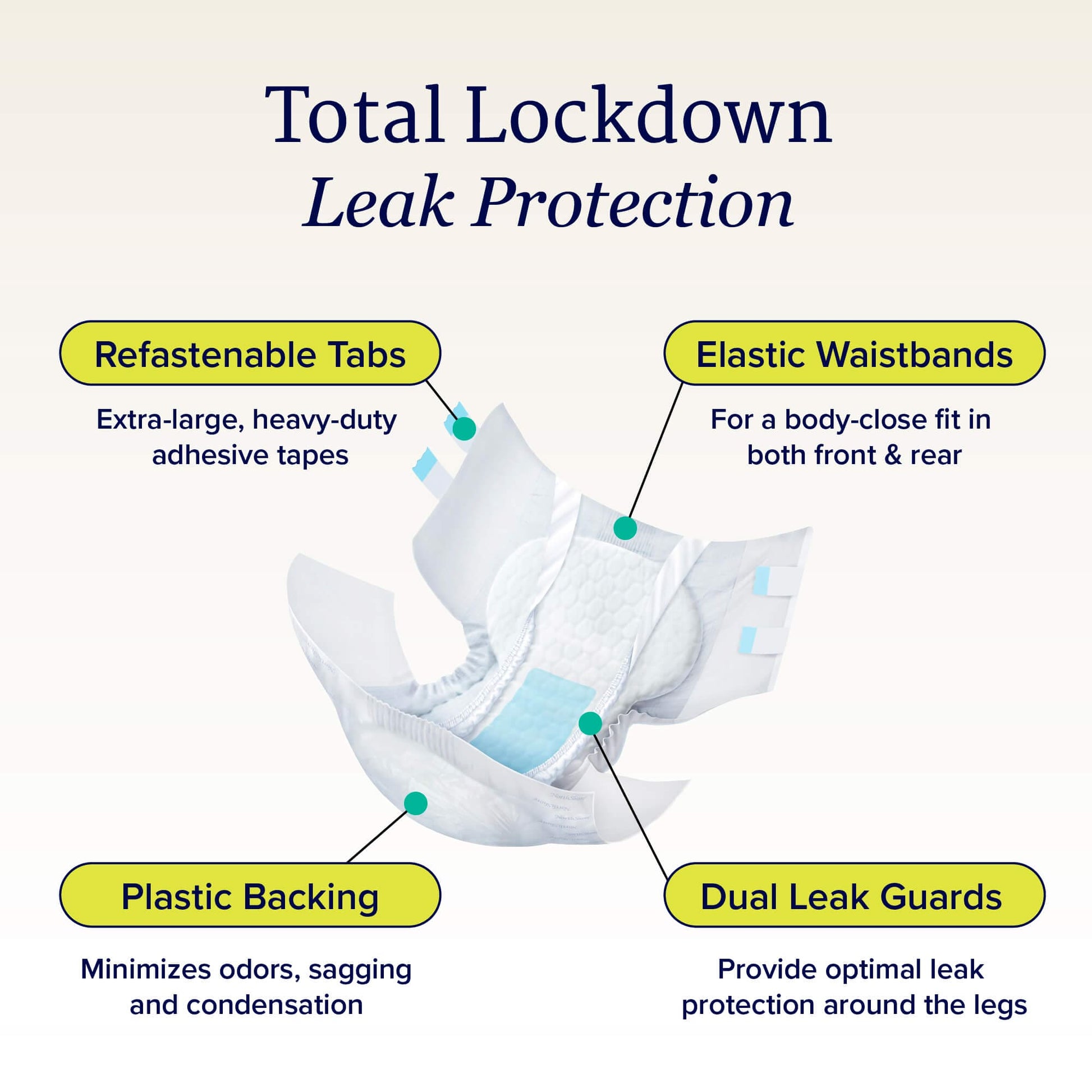 Four heavy-duty, refastenable tapes for a secure, stay-put fit