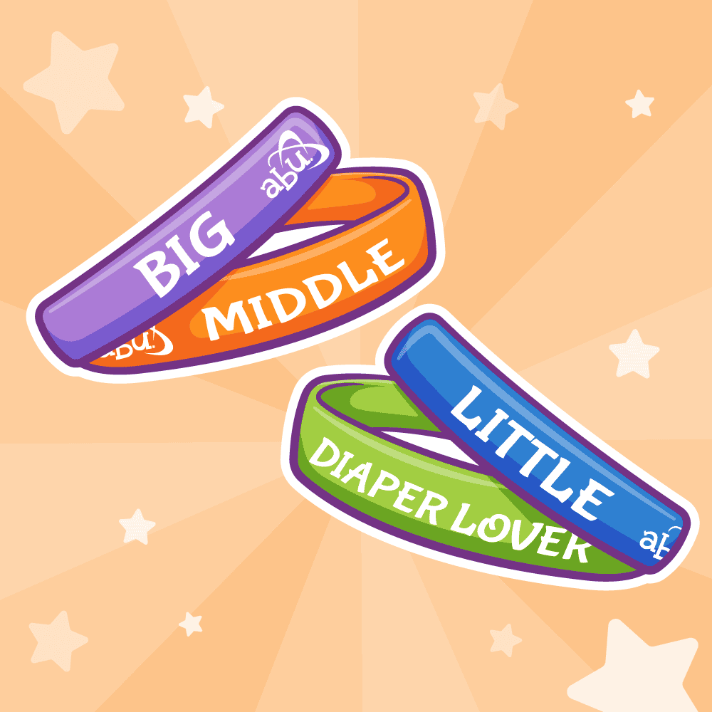 Whether you're feeling "LITTLE" in blue, "MIDDLE" in orange, "BIG" in purple, or proudly declaring your "DIAPER LOVER" status in green, these wristbands let you wear your identity with style and confidence.